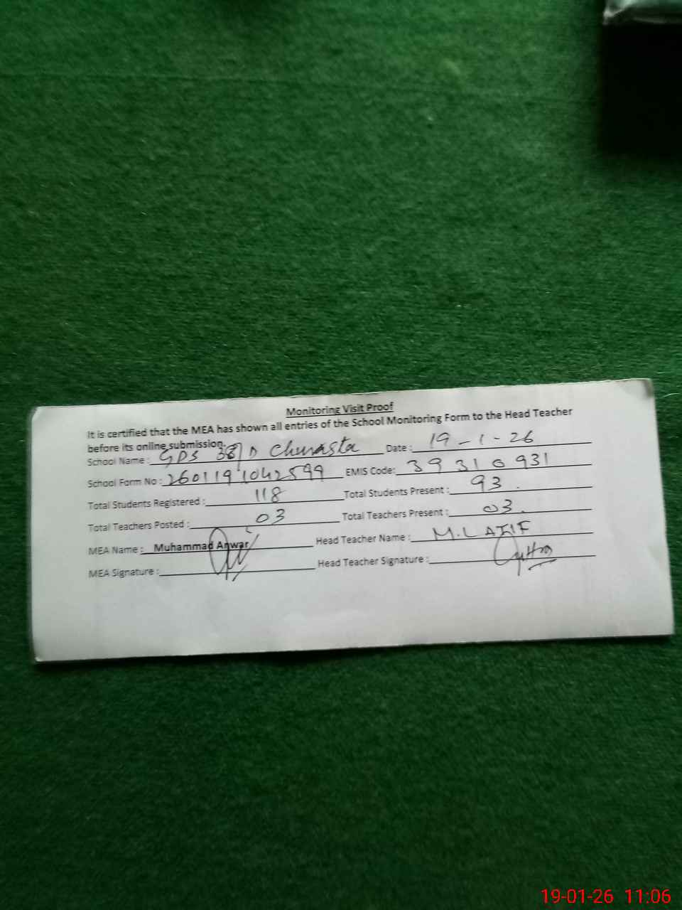 | Attendance Register | Head Teacher | MEA with School | Visit Proof |