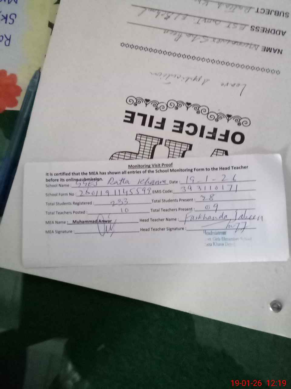 | Attendance Register | Head Teacher | MEA with School | Visit Proof |