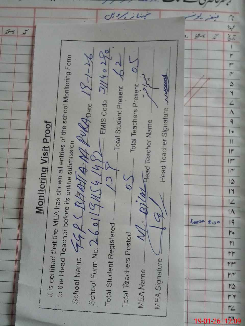 | Attendance Register | Head Teacher | MEA with School | Visit Proof |