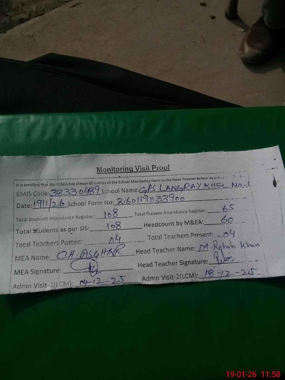 | Attendance Register | Head Teacher | MEA with School | Visit Proof |