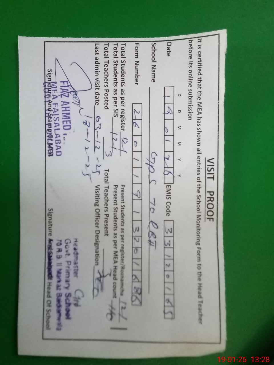 | Attendance Register | Head Teacher | MEA with School | Visit Proof |