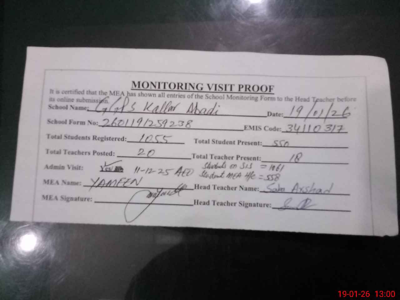 | Attendance Register | Head Teacher | MEA with School | Visit Proof |