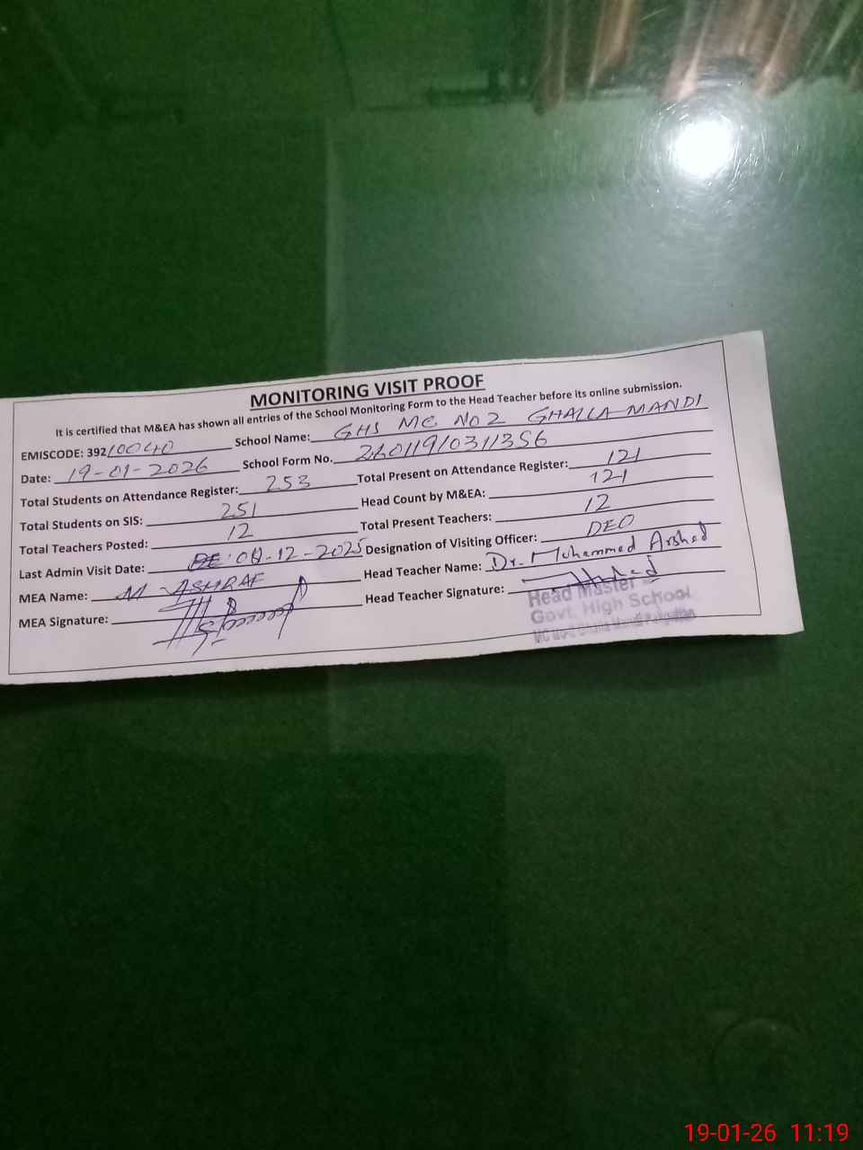 | Attendance Register | Head Teacher | MEA with School | Visit Proof |