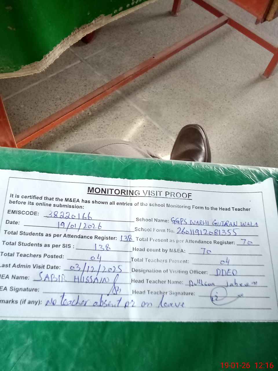 | Remarks (Use Separate Page if Required): no teacher absent total students on register 138 total students on SiS 138 last admin visit by DDEO on 03 Dec 2025 | |||||