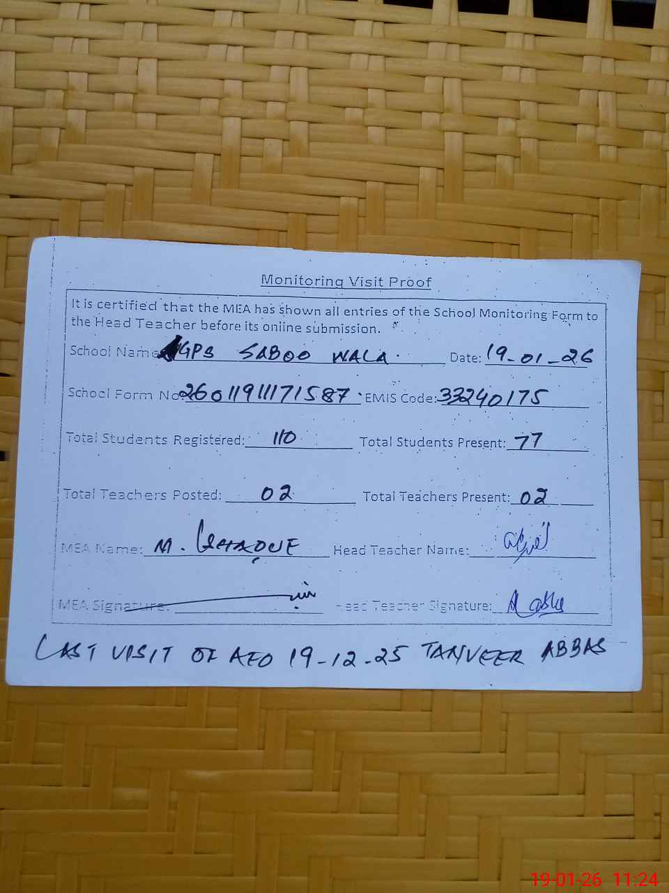 | Certified that this School was Inspected by the Undersigned MEA/DMO Today and the Information Stated Above is as Per Record. | |||||