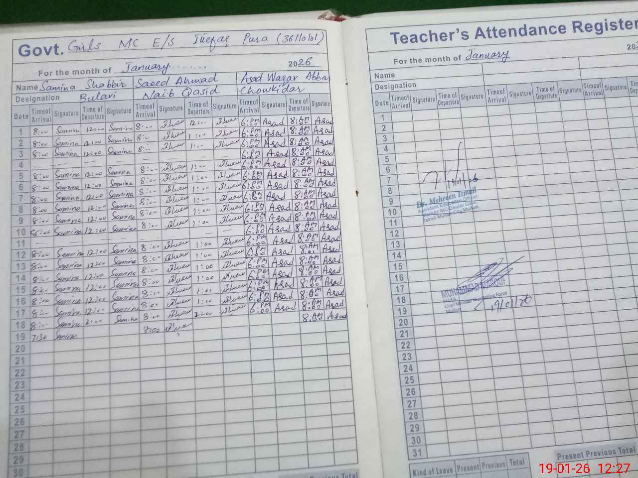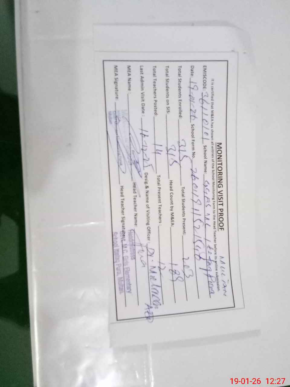 | Attendance Register | Head Teacher | MEA with School | Visit Proof |