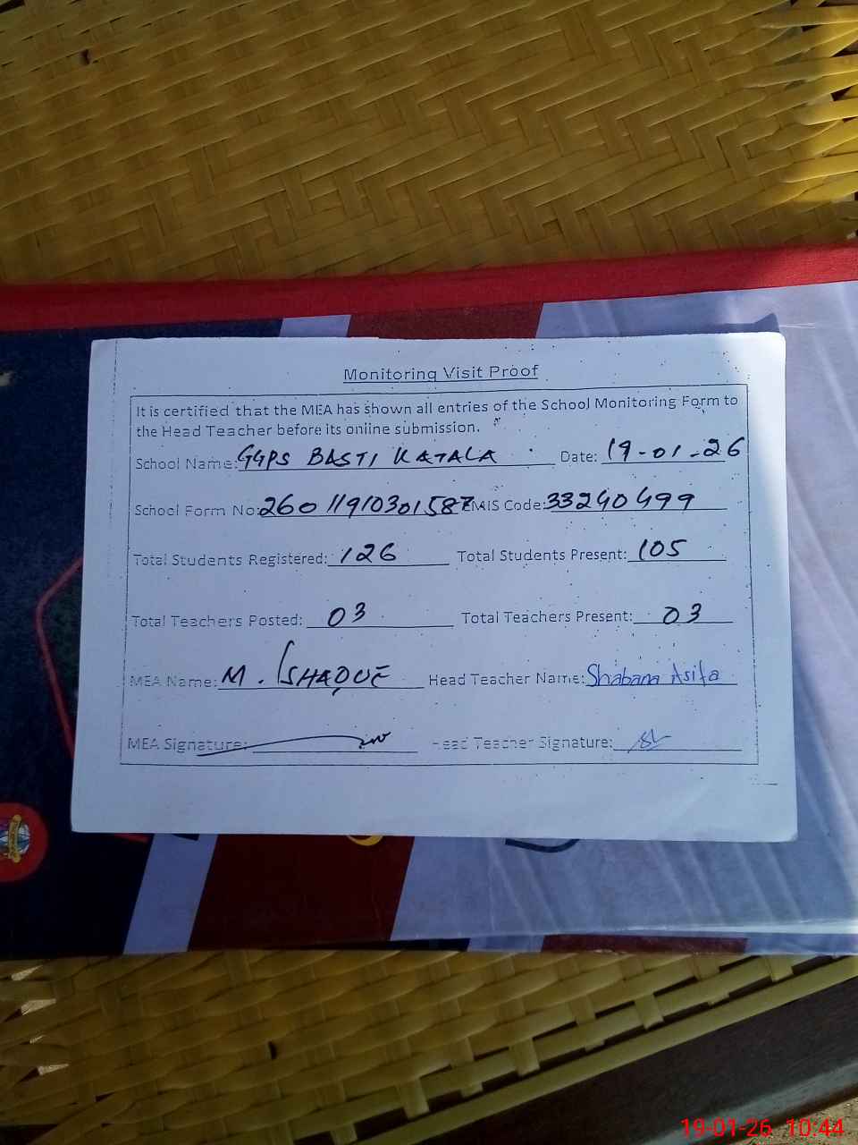 | Certified that this School was Inspected by the Undersigned MEA/DMO Today and the Information Stated Above is as Per Record. | |||||
