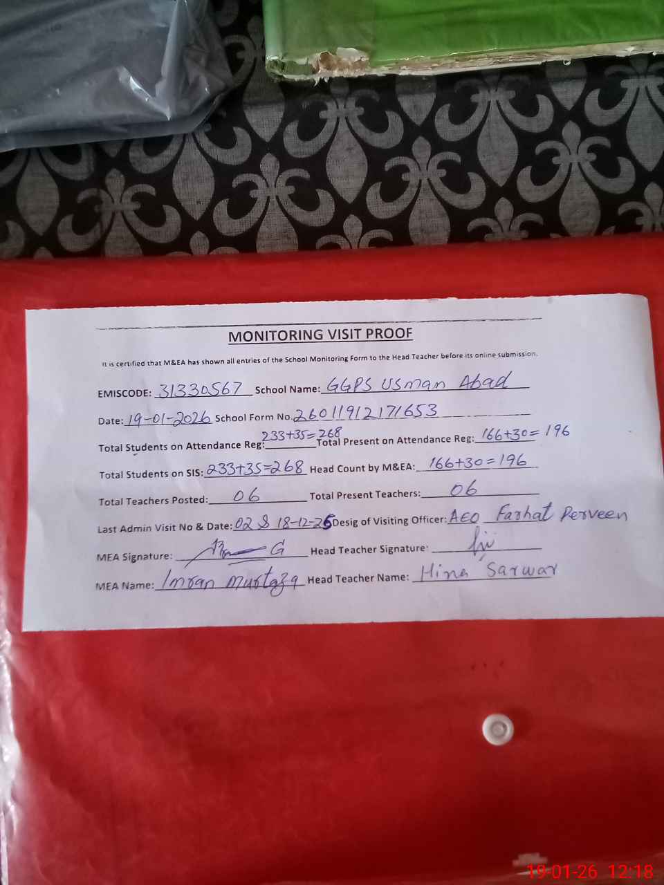| Attendance Register | Head Teacher | MEA with School | Visit Proof |