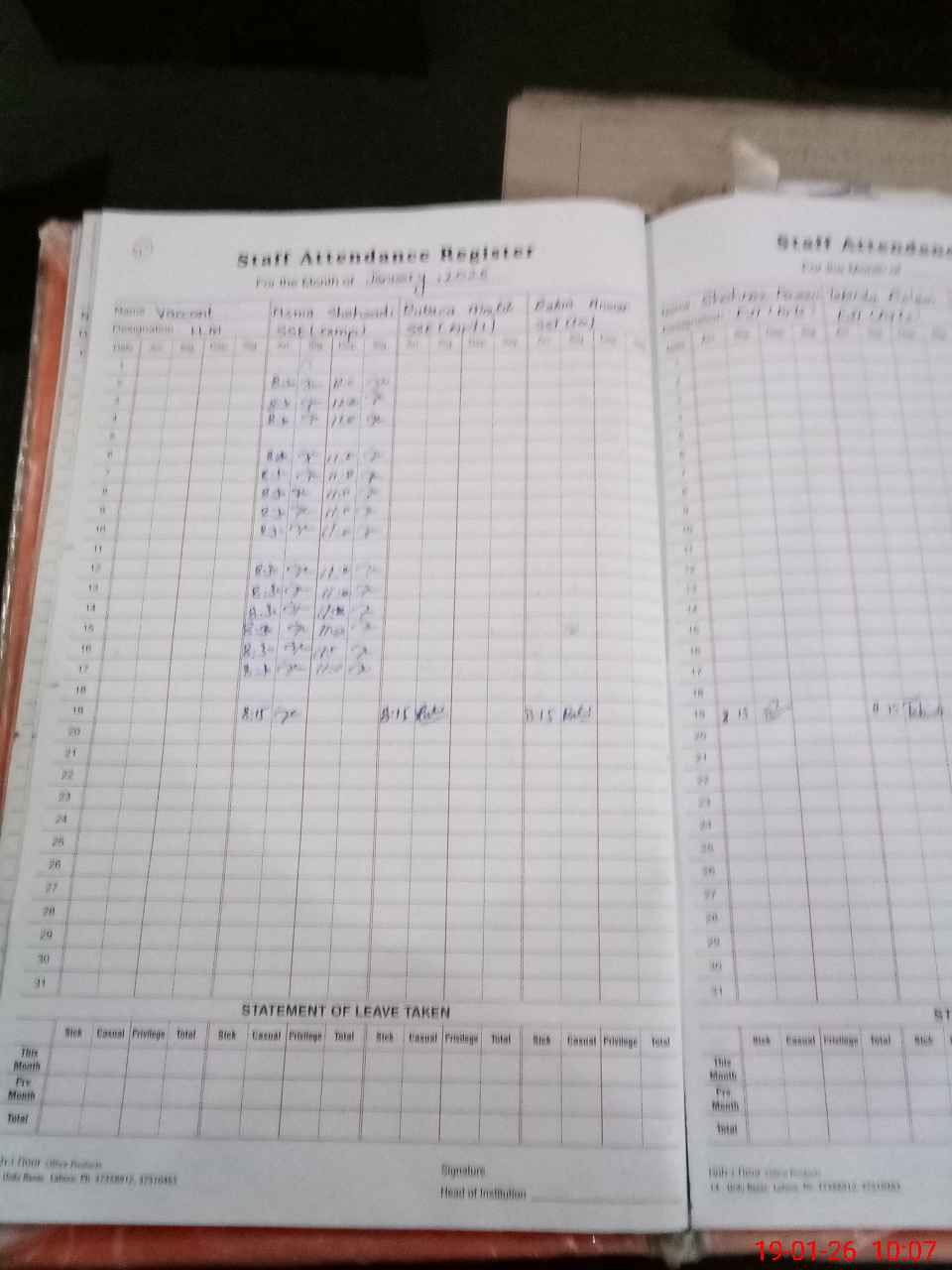 | CNIC | Full Name | Designation | R/C | Absence During Last Calender Month |