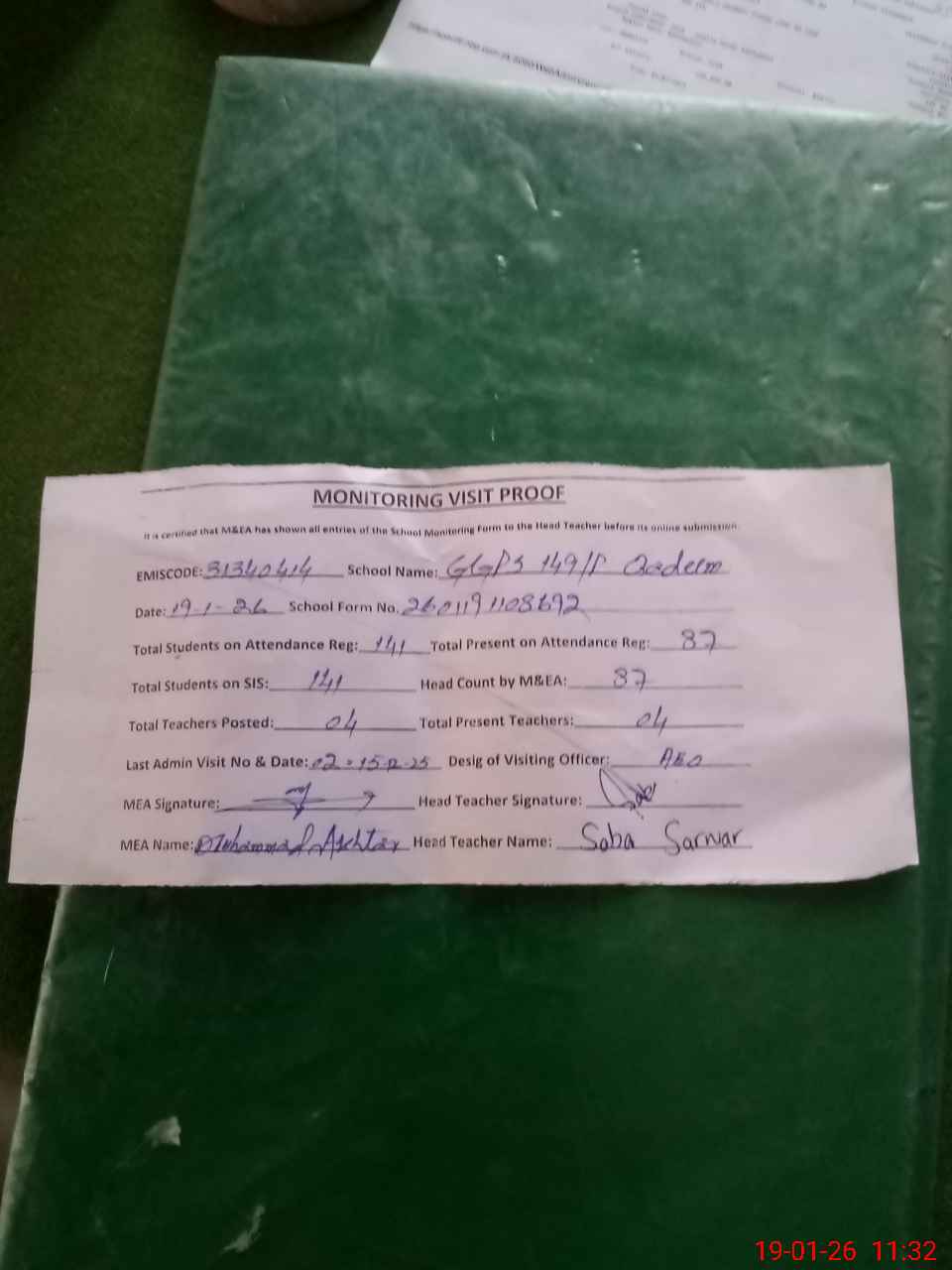 | Attendance Register | Head Teacher | MEA with School | Visit Proof |