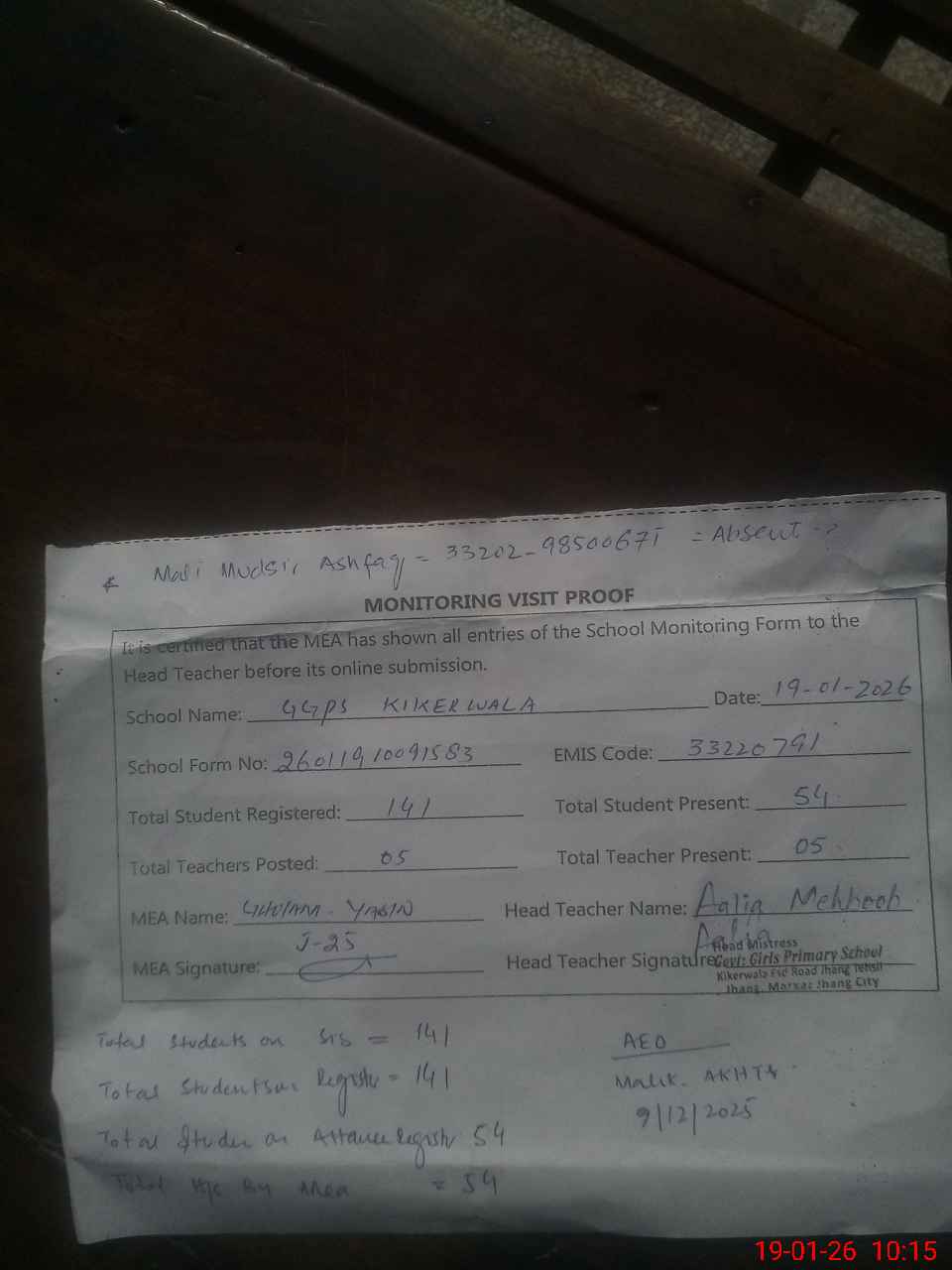 | Attendance Register | Head Teacher | MEA with School | Visit Proof |