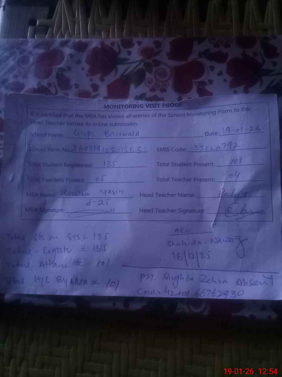 | Attendance Register | Head Teacher | MEA with School | Visit Proof |