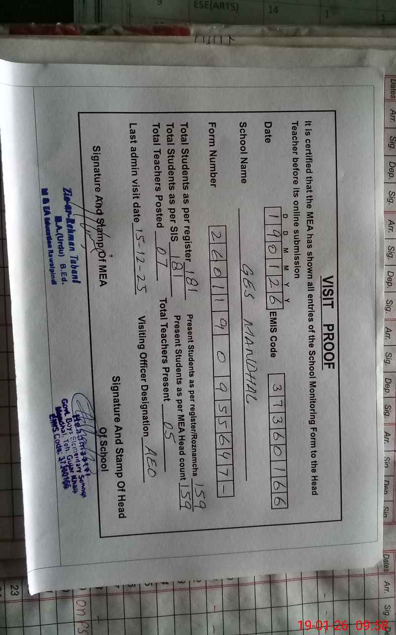 | Certified that this School was Inspected by the Undersigned MEA/DMO Today and the Information Stated Above is as Per Record. | |||||