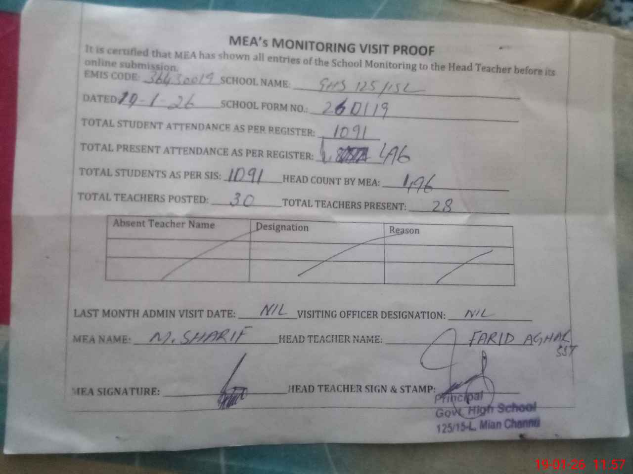 | Attendance Register | Head Teacher | MEA with School | Visit Proof |