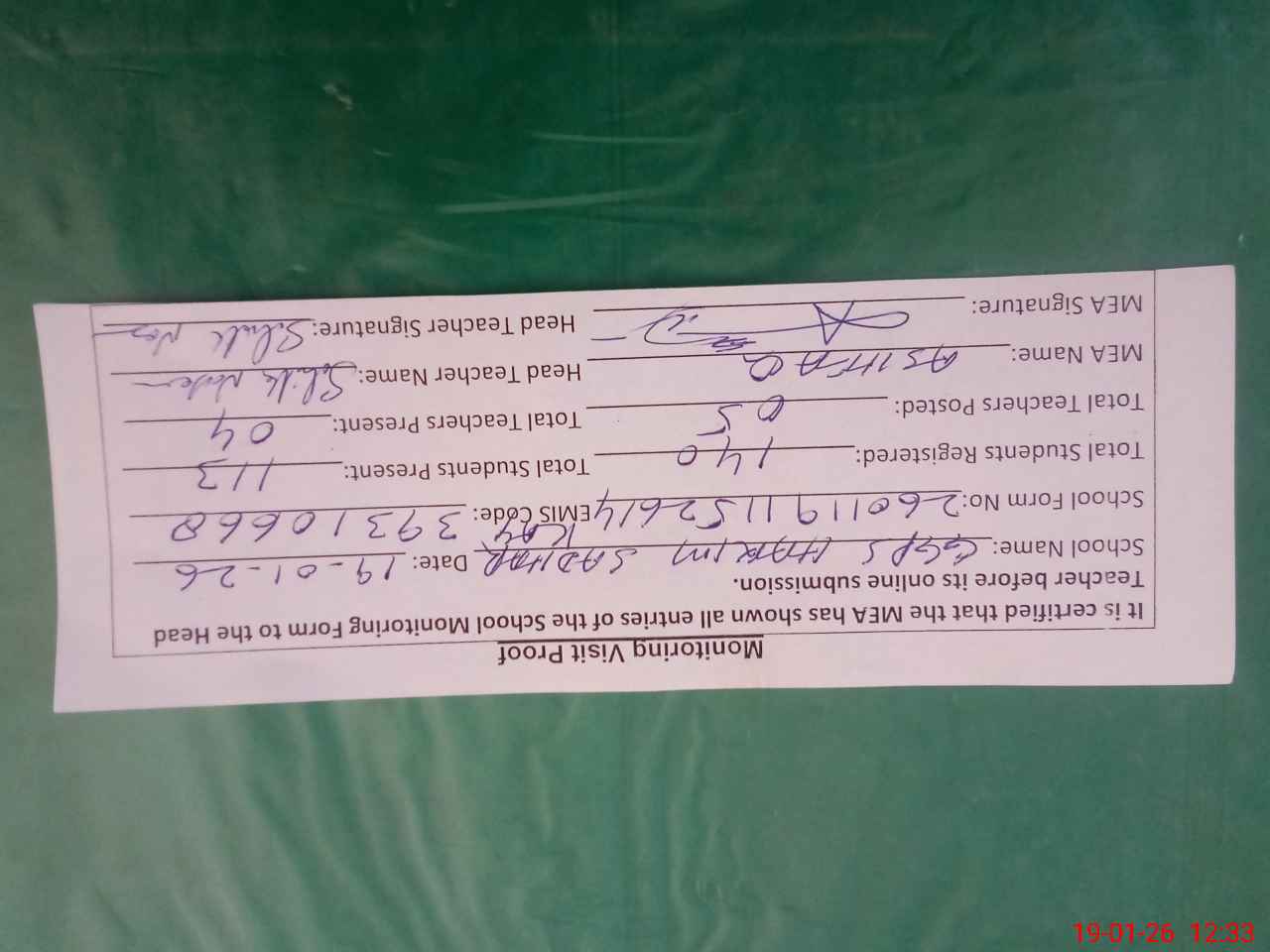 | Attendance Register | Head Teacher | MEA with School | Visit Proof |