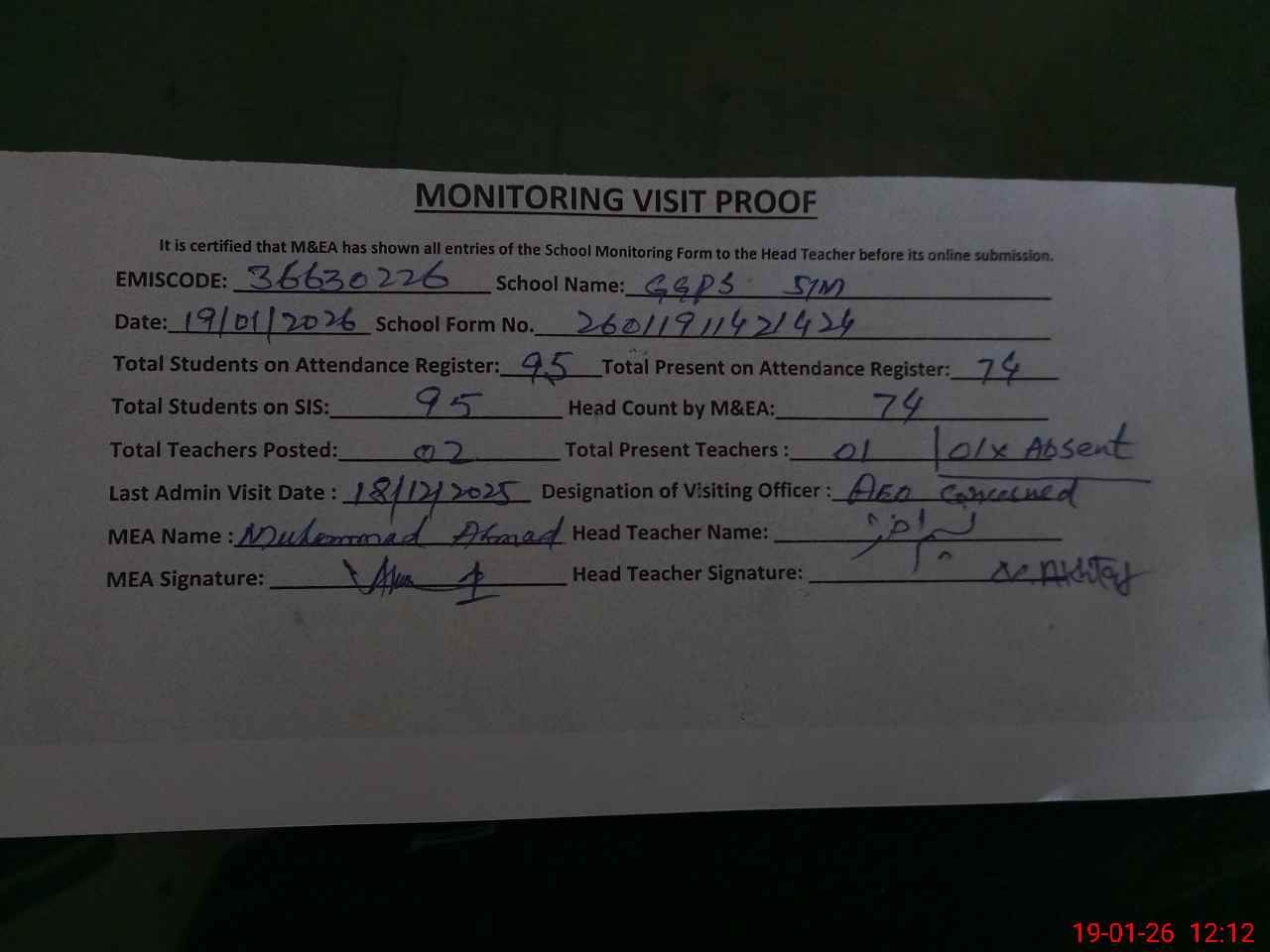 | Attendance Register | Head Teacher | MEA with School | Visit Proof |