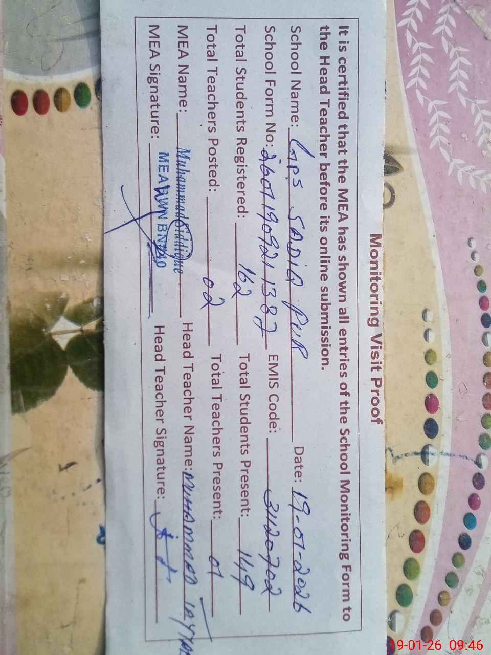 | EMIS Code: 31120702 | Name of School: GPS SADIQ PUR | |||