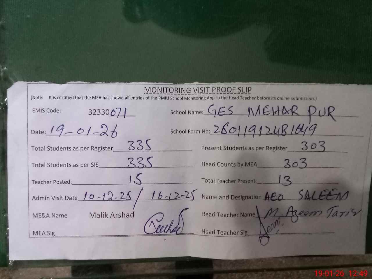 | Attendance Register | Head Teacher | MEA with School | Visit Proof |
