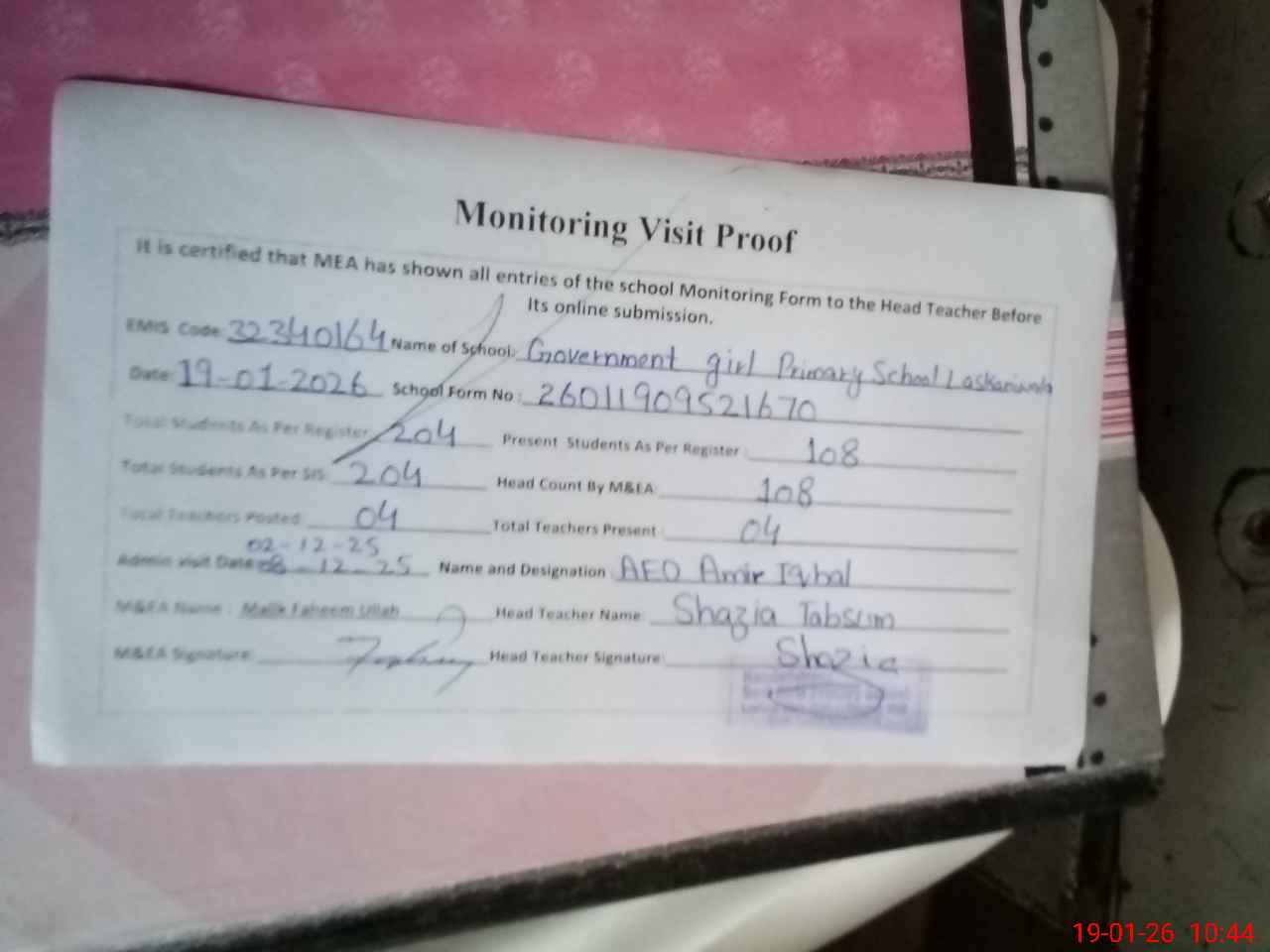 | Certified that this School was Inspected by the Undersigned MEA/DMO Today and the Information Stated Above is as Per Record. | |||||
