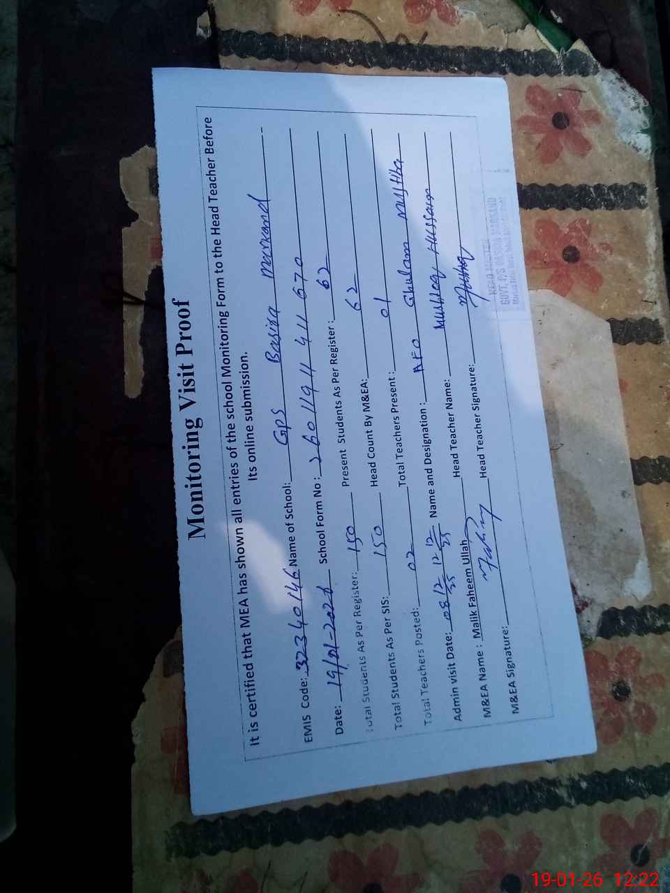 | Attendance Register | Head Teacher | MEA with School | Visit Proof |