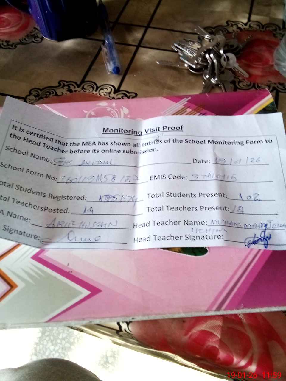 | Attendance Register | Head Teacher | MEA with School | Visit Proof |