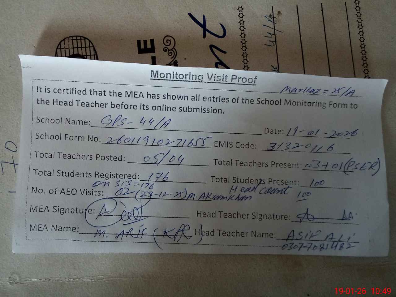 | Attendance Register | Head Teacher | MEA with School | Visit Proof |