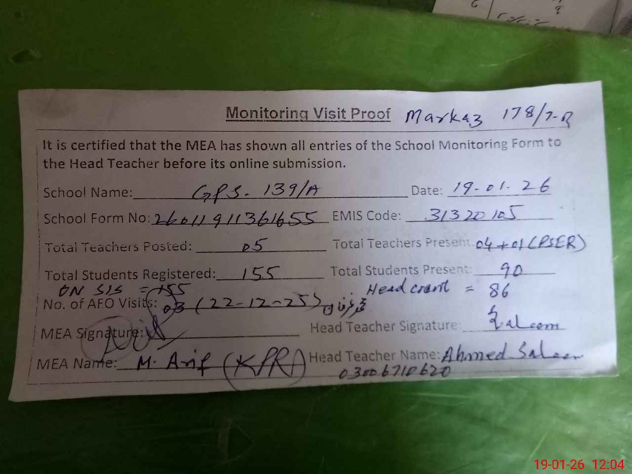 | EMIS Code: 31320105 | Name of School: GPS CHAK 139/A | |||