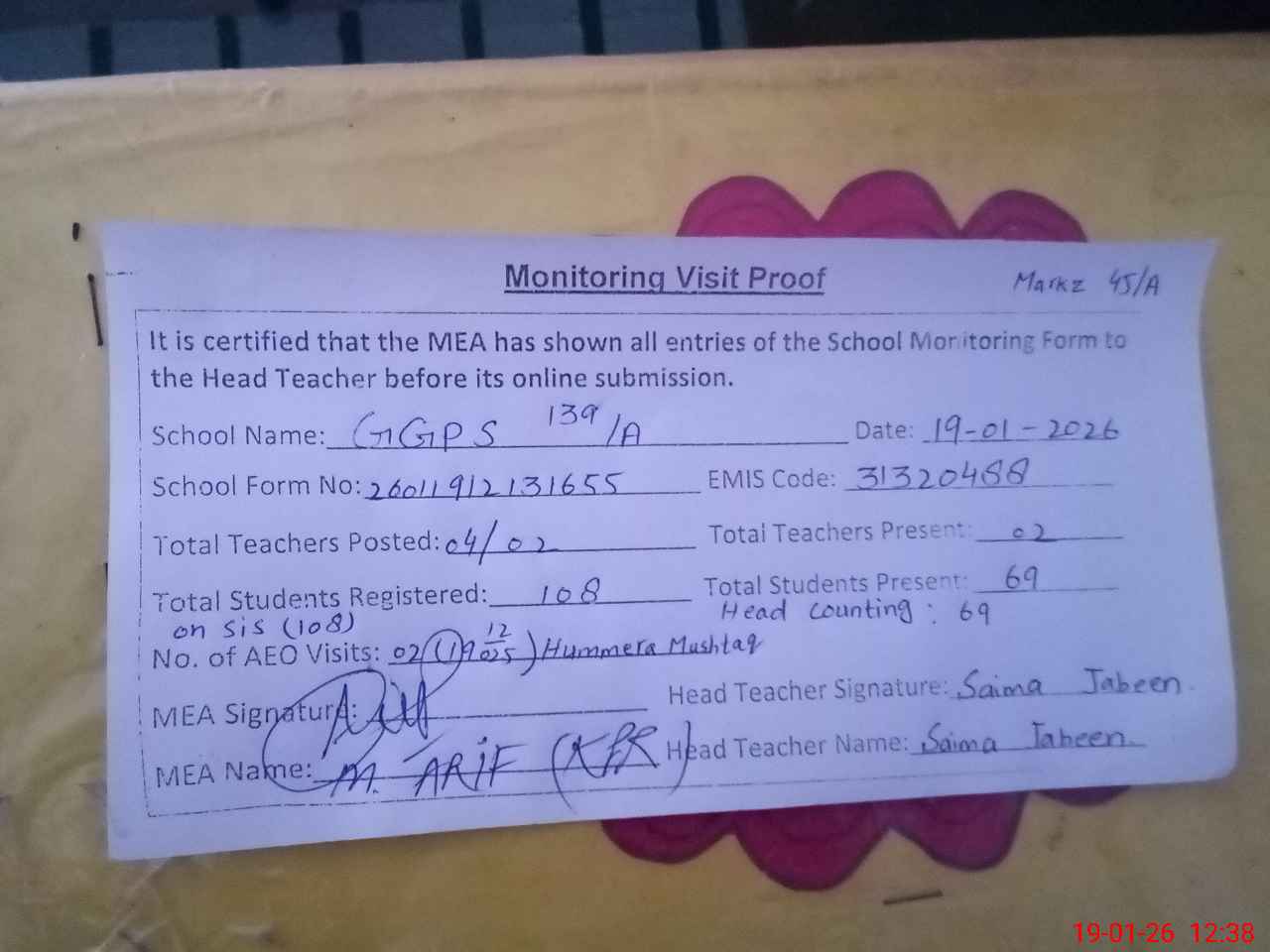 | EMIS Code: 31320488 | Name of School: GGPS CHAK NO.139/A | |||