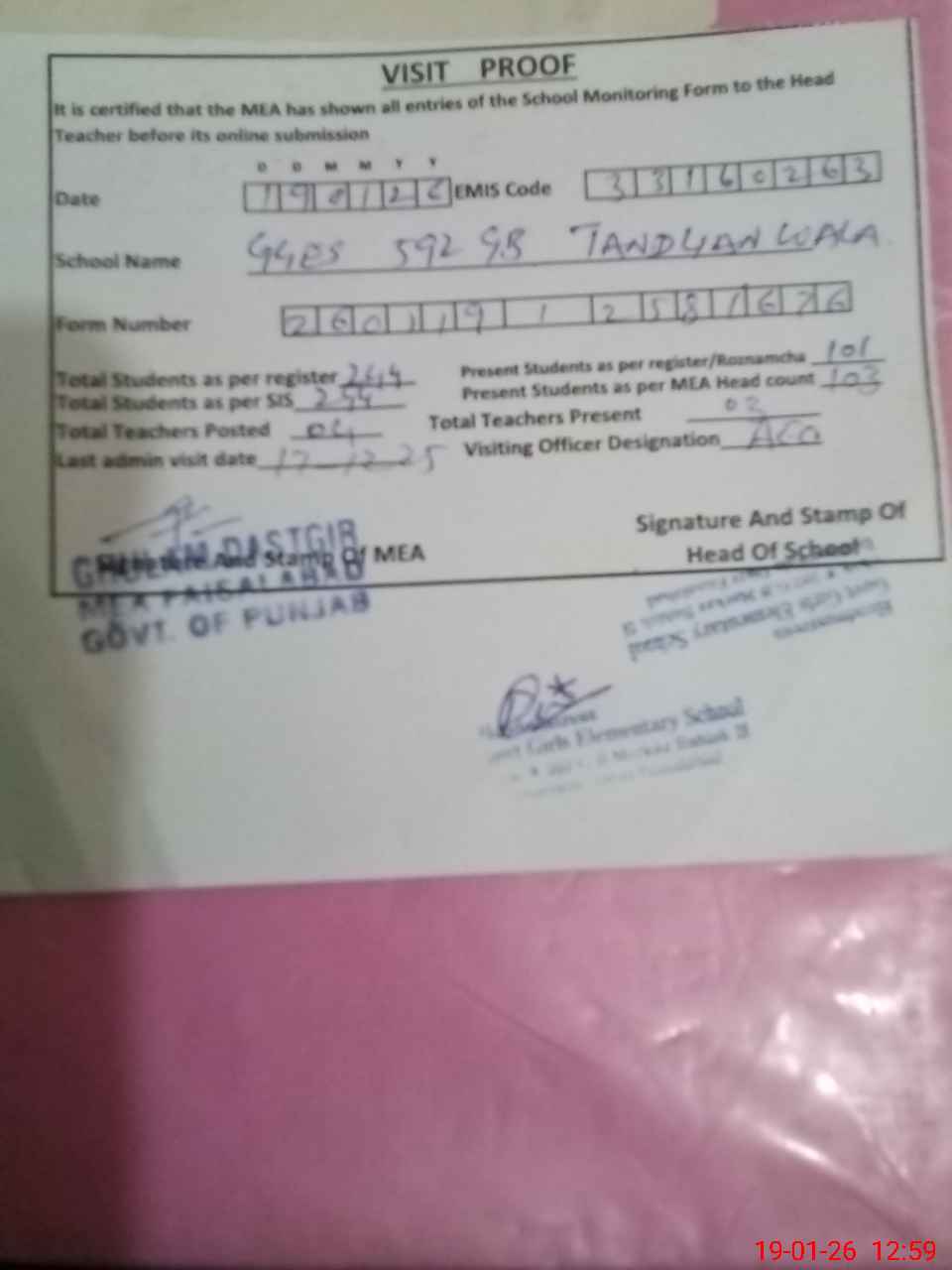 | Certified that this School was Inspected by the Undersigned MEA/DMO Today and the Information Stated Above is as Per Record. | |||||