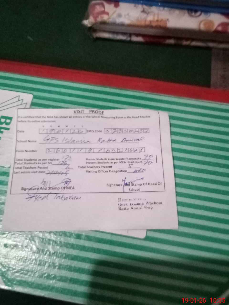 | Attendance Register | Head Teacher | MEA with School | Visit Proof |