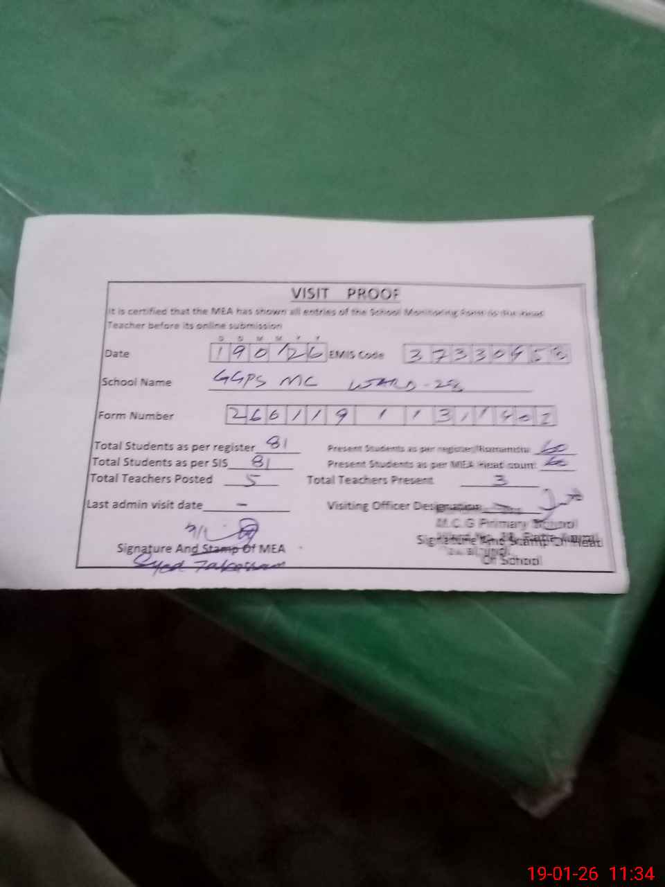 | Attendance Register | Head Teacher | MEA with School | Visit Proof |