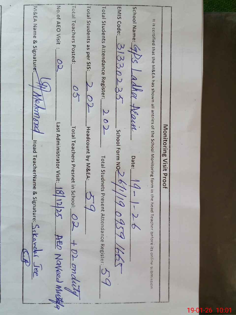 | Attendance Register | Head Teacher | MEA with School | Visit Proof |