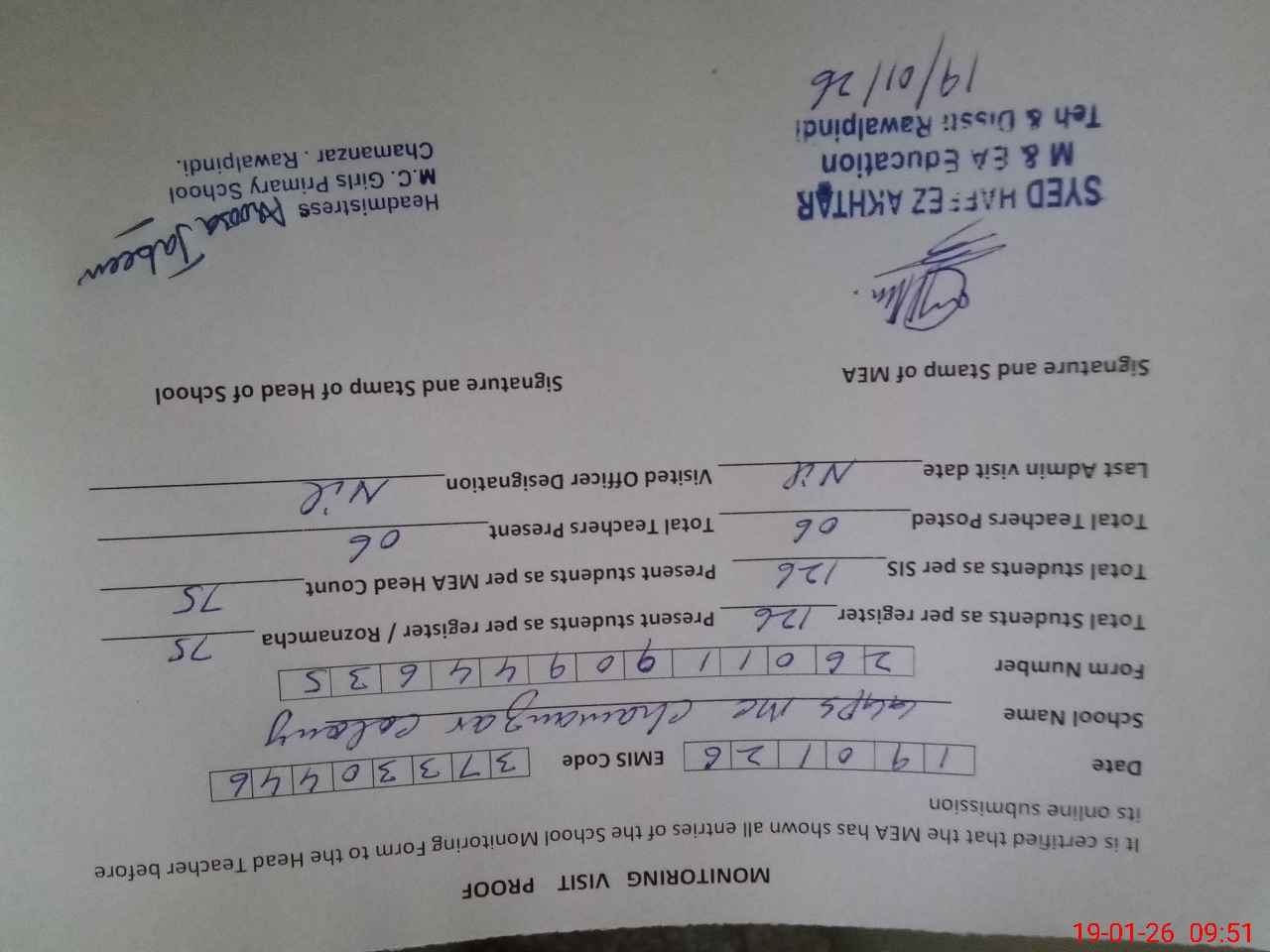 | Certified that this School was Inspected by the Undersigned MEA/DMO Today and the Information Stated Above is as Per Record. | |||||