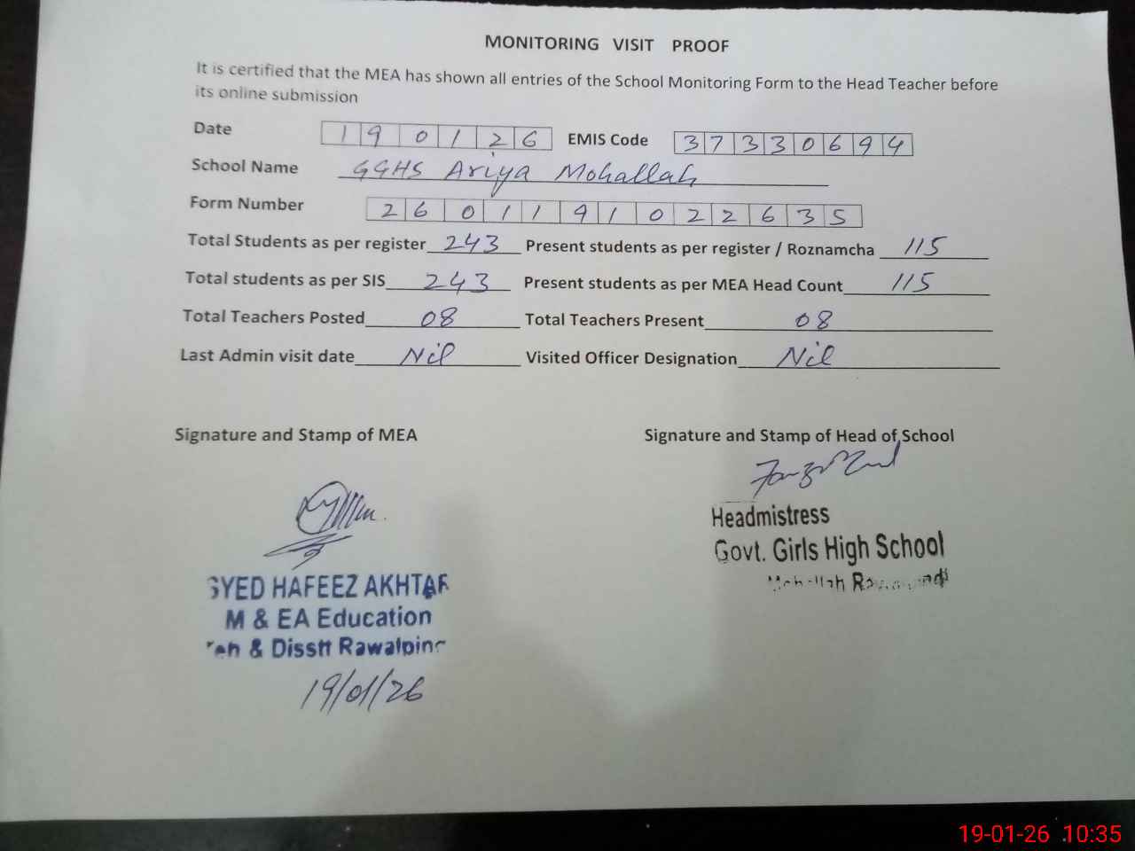 | Certified that this School was Inspected by the Undersigned MEA/DMO Today and the Information Stated Above is as Per Record. | |||||