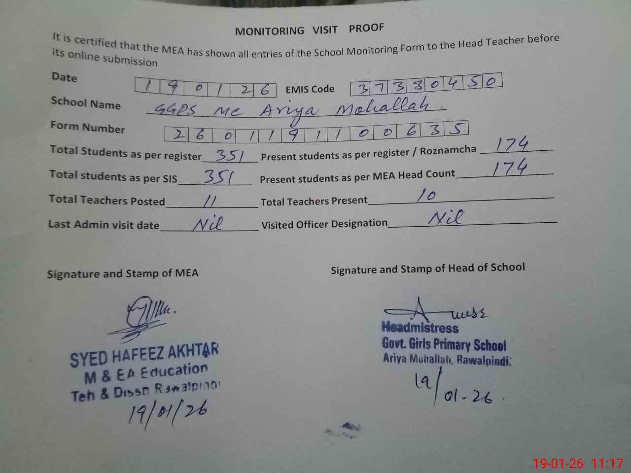 | Certified that this School was Inspected by the Undersigned MEA/DMO Today and the Information Stated Above is as Per Record. | |||||