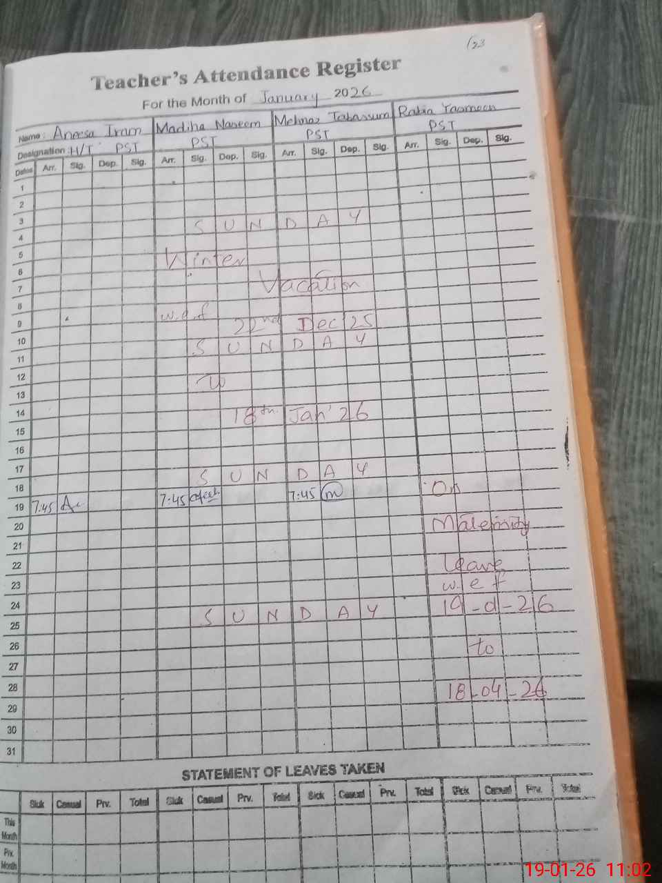 | 37**** | Ra**** Ya**** | PST Science/Maths | Regular | 0 | 0 | 0 | 0 | 0 | 0 | 0 | 0 | 0 | Maternity |