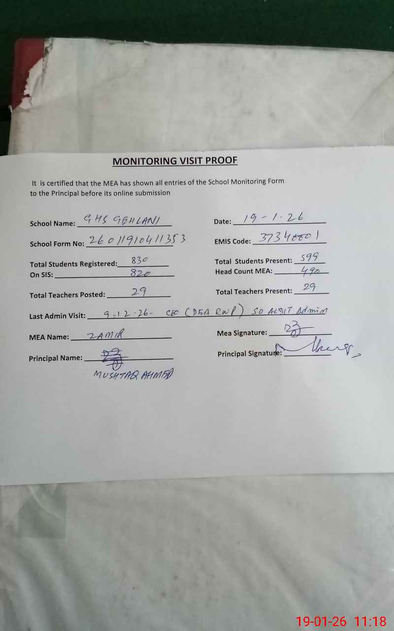 | EMIS Code: 37340001 | Name of School: GHS GELLANI MODEL WAH CANTT | |||