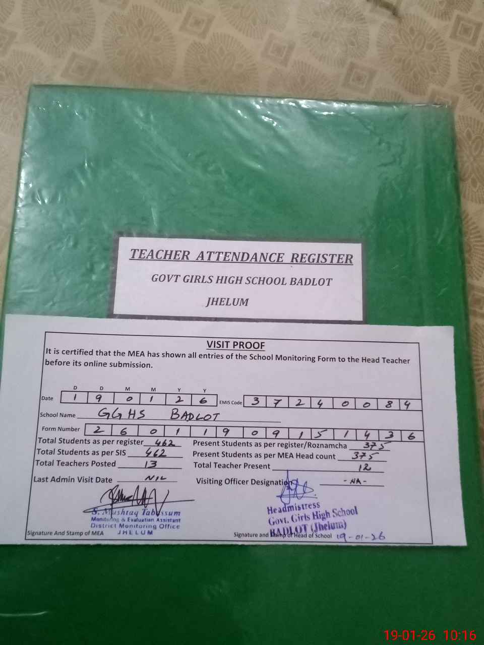 | Attendance Register | Head Teacher | MEA with School | Visit Proof |