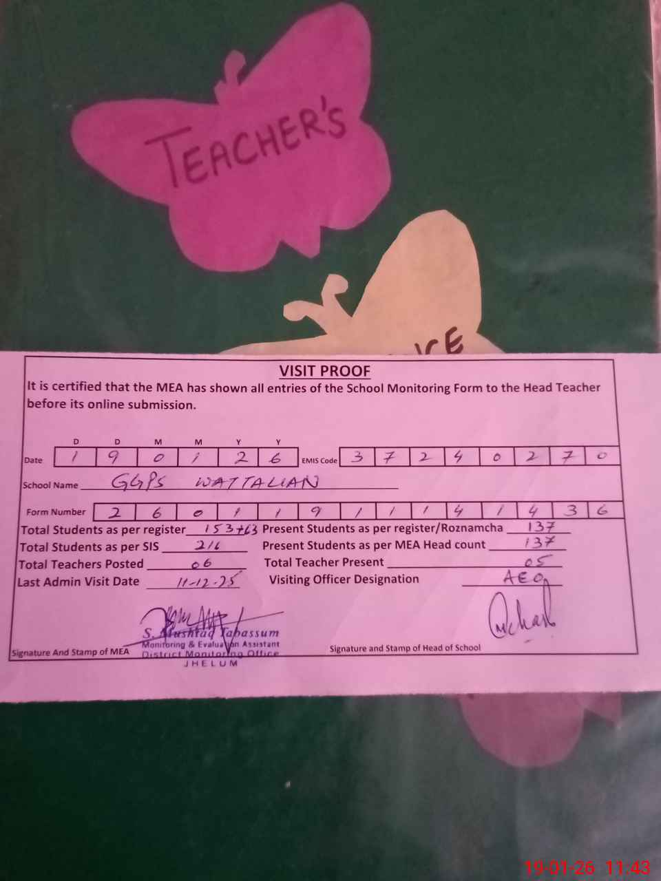 | Attendance Register | Head Teacher | MEA with School | Visit Proof |