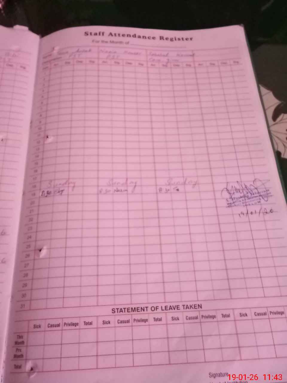| CNIC | Full Name | Designation | R/C | Absence During Last Calender Month |