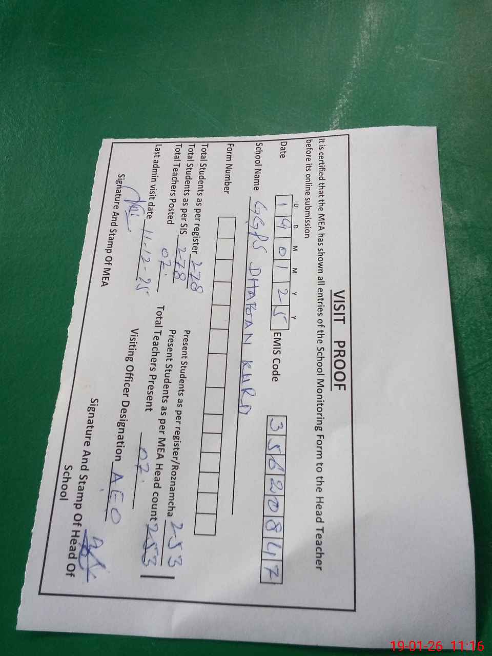 | Attendance Register | Head Teacher | MEA with School | Visit Proof |