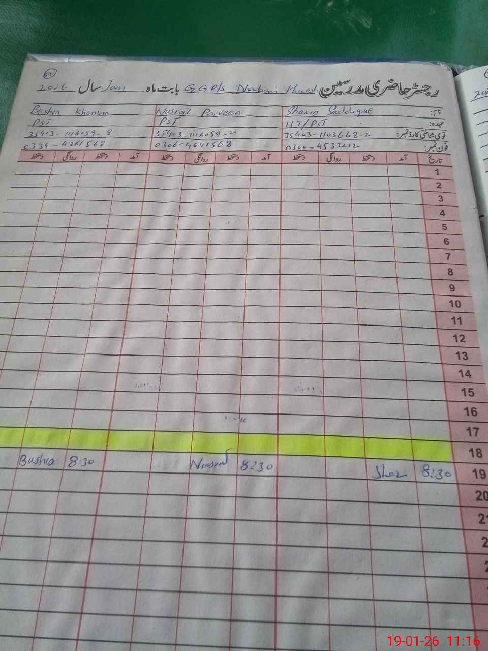 | CNIC | Full Name | Designation | R/C | Absence During Last Calender Month |