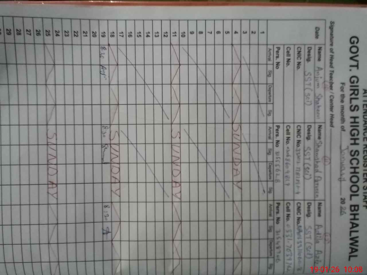 | CNIC | Full Name | Designation | R/C | Absence During Last Calender Month |