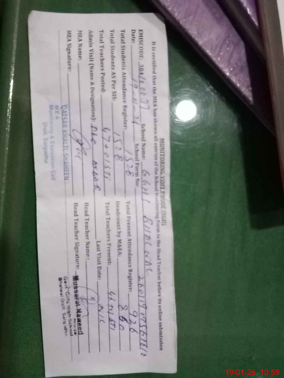 | Certified that this School was Inspected by the Undersigned MEA/DMO Today and the Information Stated Above is as Per Record. | |||||