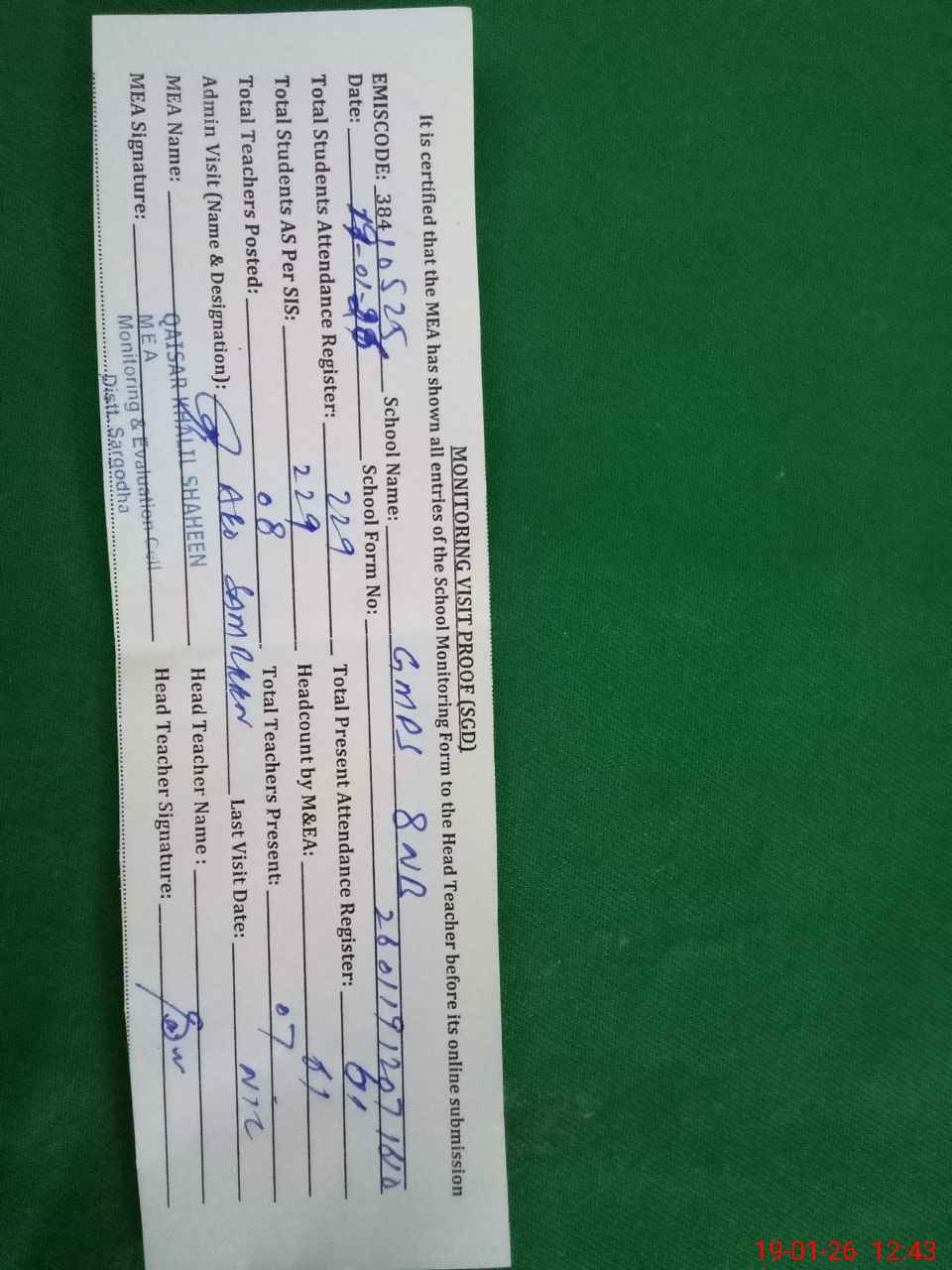 | Attendance Register | Head Teacher | MEA with School | Visit Proof |