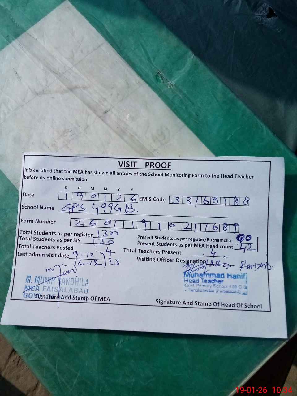 | Attendance Register | Head Teacher | MEA with School | Visit Proof |