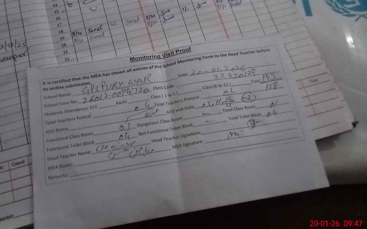 | Attendance Register | Head Teacher | MEA with School | Visit Proof |