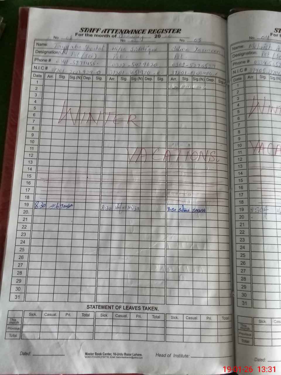 | CNIC | Full Name | Designation | R/C | Absence During Last Calender Month |