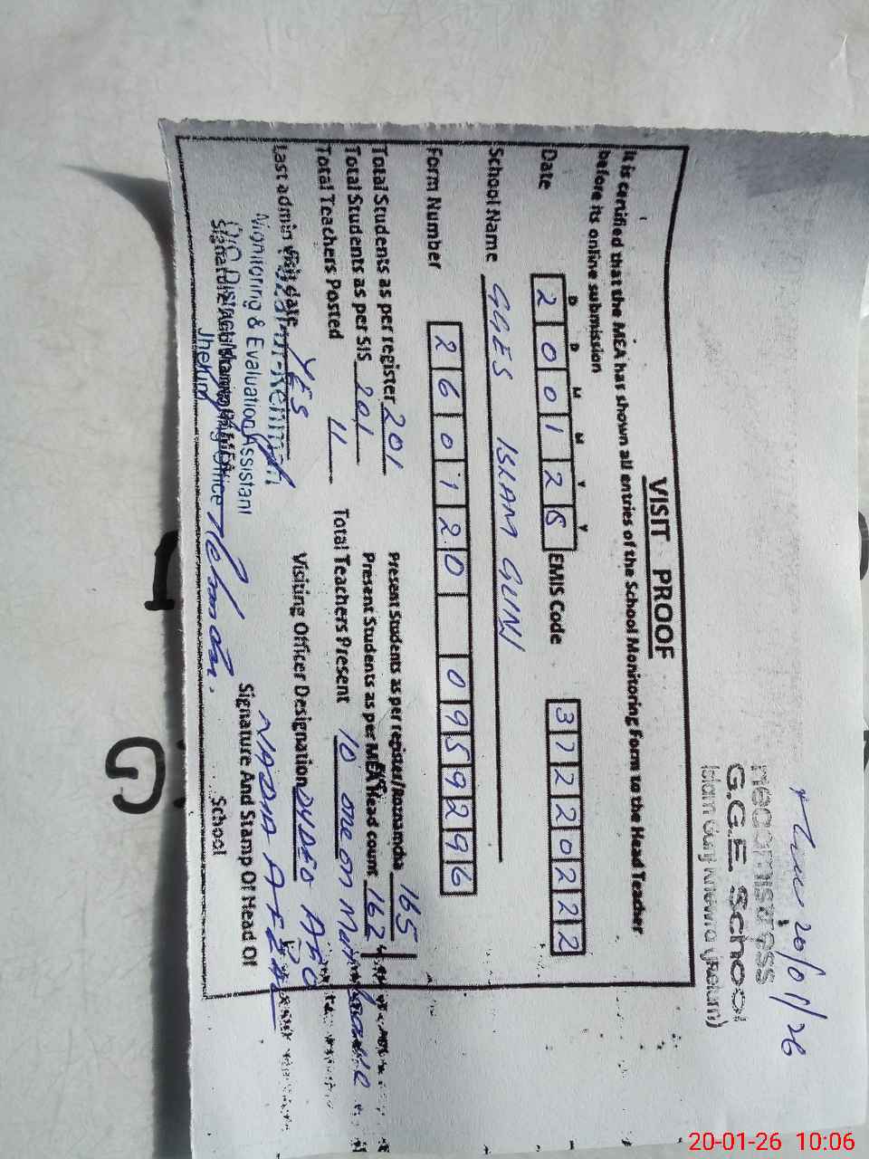 | Attendance Register | Head Teacher | MEA with School | Visit Proof |