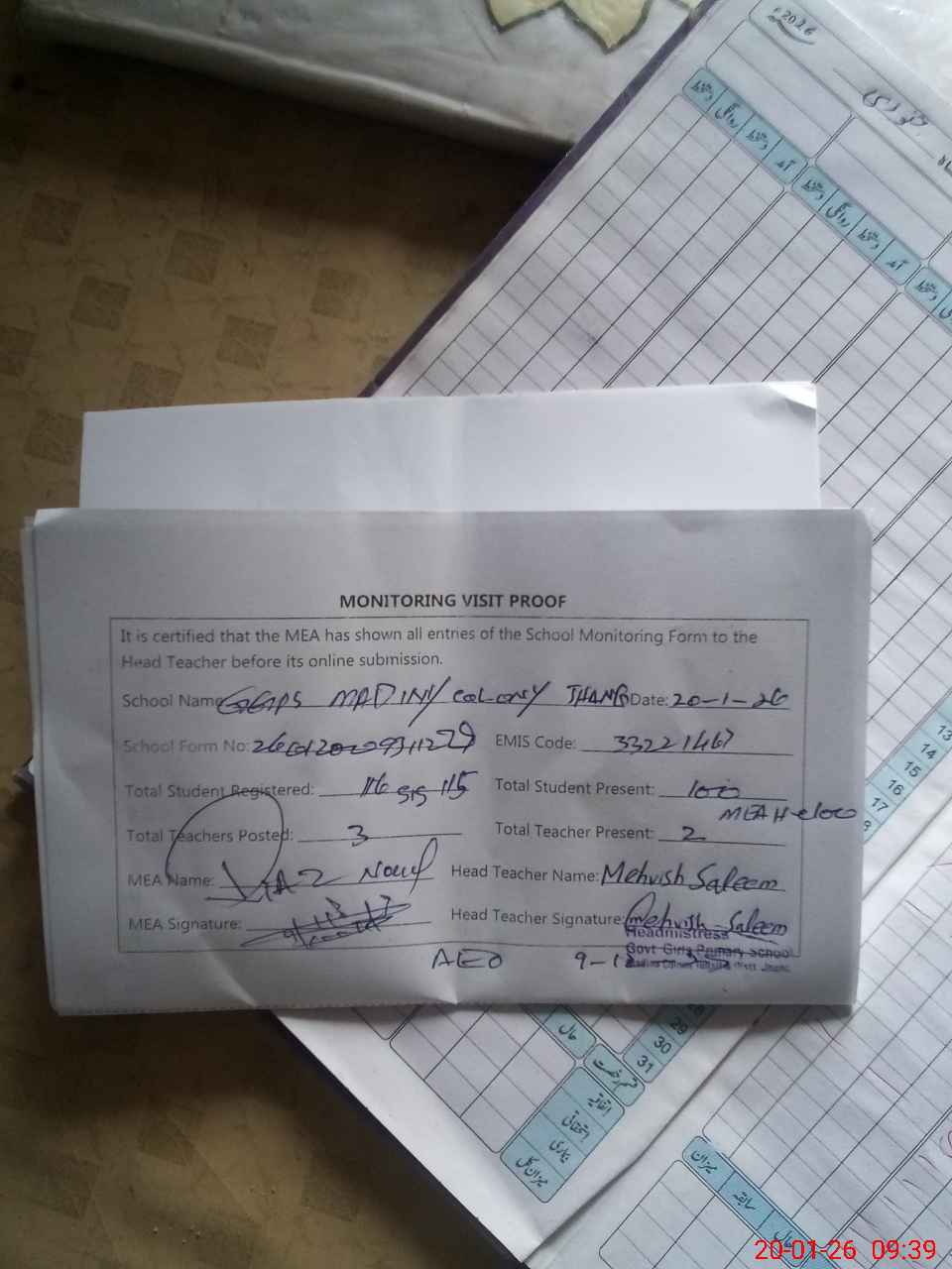 | Attendance Register | Head Teacher | MEA with School | Visit Proof |